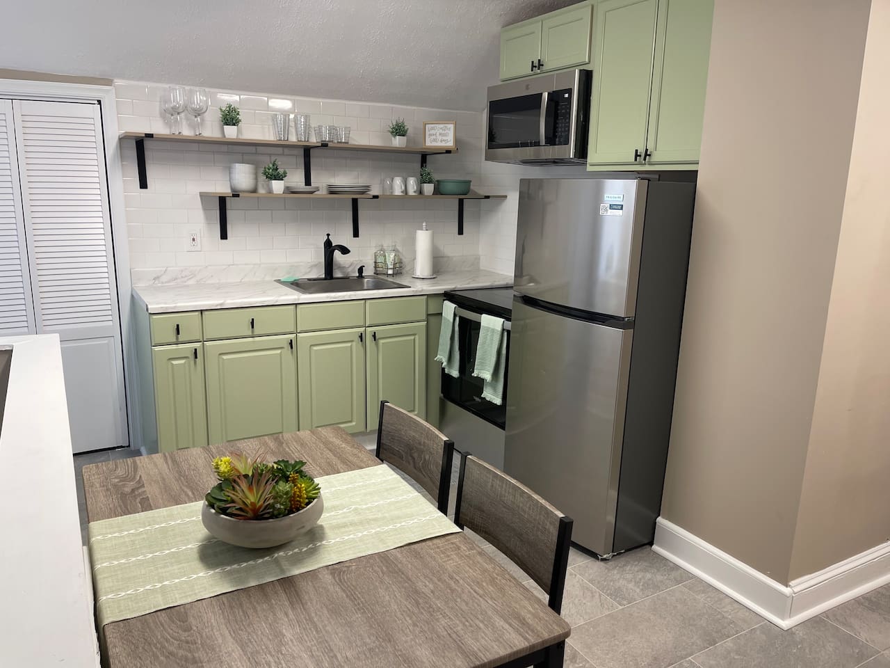 Second floor: Open space layout with kitchen flowing into dining room and living room: Full kitchen with fridge, stove/oven, microwave, toaster oven; and coffee maker