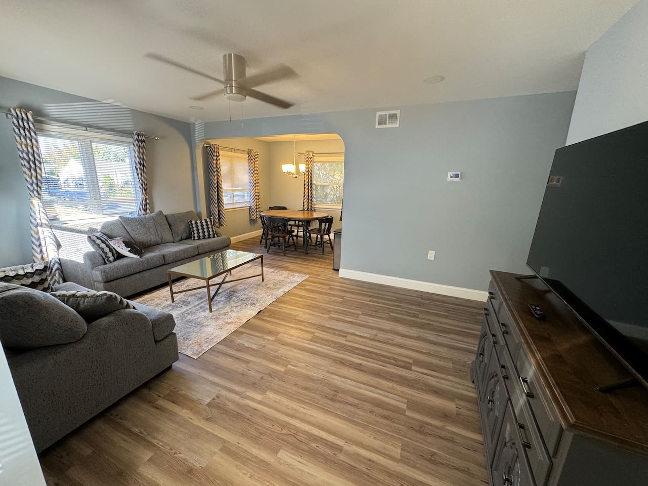 Bring the whole family to this great place with lots of room for fun. Relax in the spacious open living room that opens into the fully equipped kitchen. The kitchen leads out to the back deck perfect for grilling and overlooking the large backyard which is fully fenced .