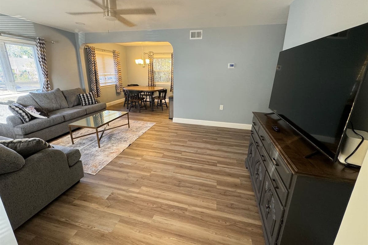 The cozy living room is the perfect place to relax, featuring comfortable seating and a TV for streaming or unwinding after a busy day. Each of the three bedrooms is furnished with clothing storage and its own smart TV, providing privacy and comfort for everyone in your group.